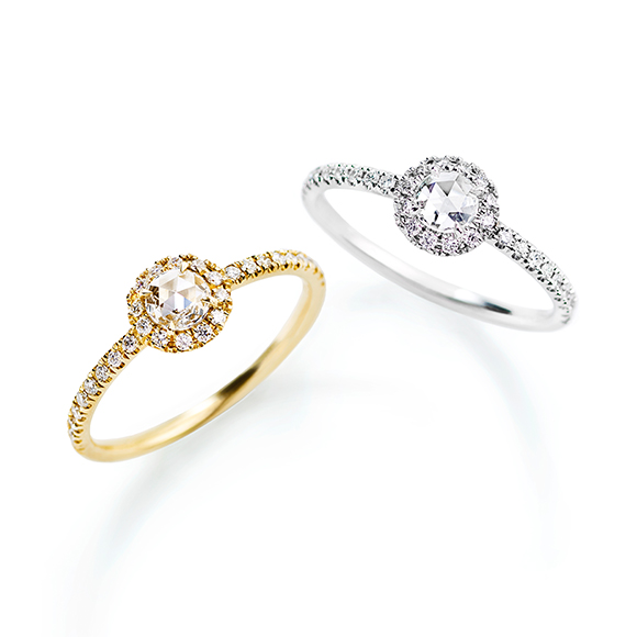 ローズカットダイヤのクラシックな輝きと、ラウンドメレダイヤの細やかなきらめきの2つのコントラストを楽しめます。