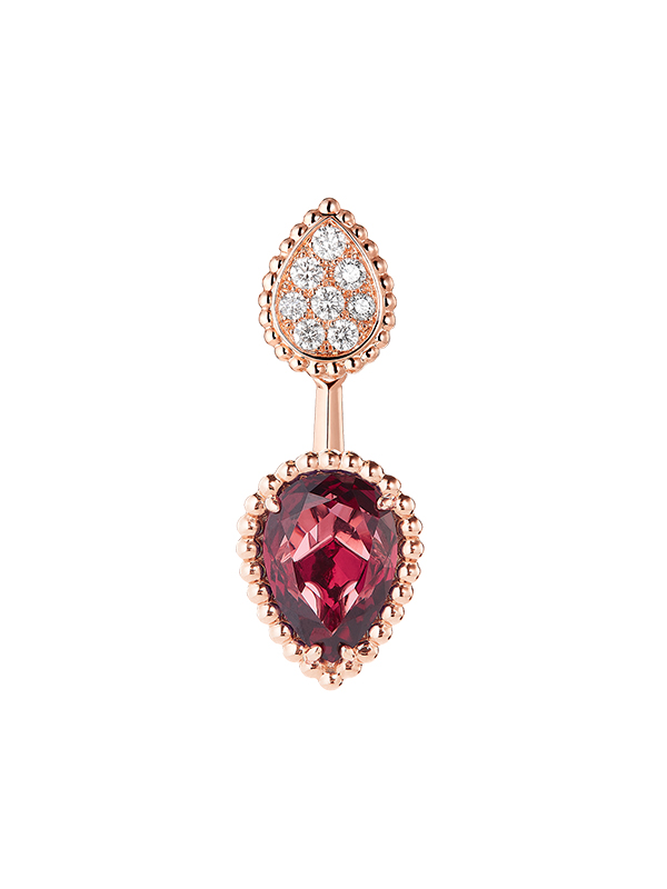 品名:セルパンボエム 2モチーフ シングル スタッズイヤリング/品番:JCO01430/素材:ペアシェイプ ロードライトガーネット1石(2.10カラット)、ラウンドカット ダイヤモンド8石(計0.16カラット)、18Kピンクゴールド/税込価格:¥544,500 (2/7~ 新価格¥588,500)