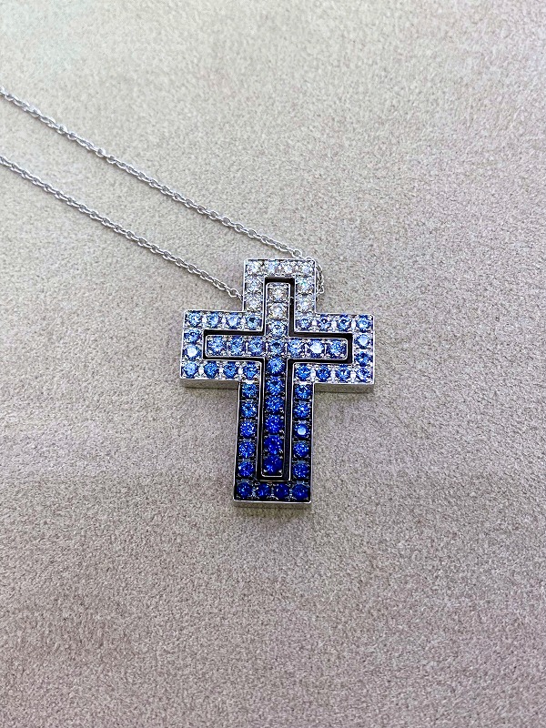 サファイア×ダイヤモンドのグラデーションでクールな印象を持たせるアイスバーグ。大西洋に浮かぶ雄大な氷山の色調にインスパイアされて登場しました。ネックレスとクロスモチーフのフレームはホワイトゴールド製。ダイヤモンドの煌めきとサファイアのブルーが際立つ素材です。