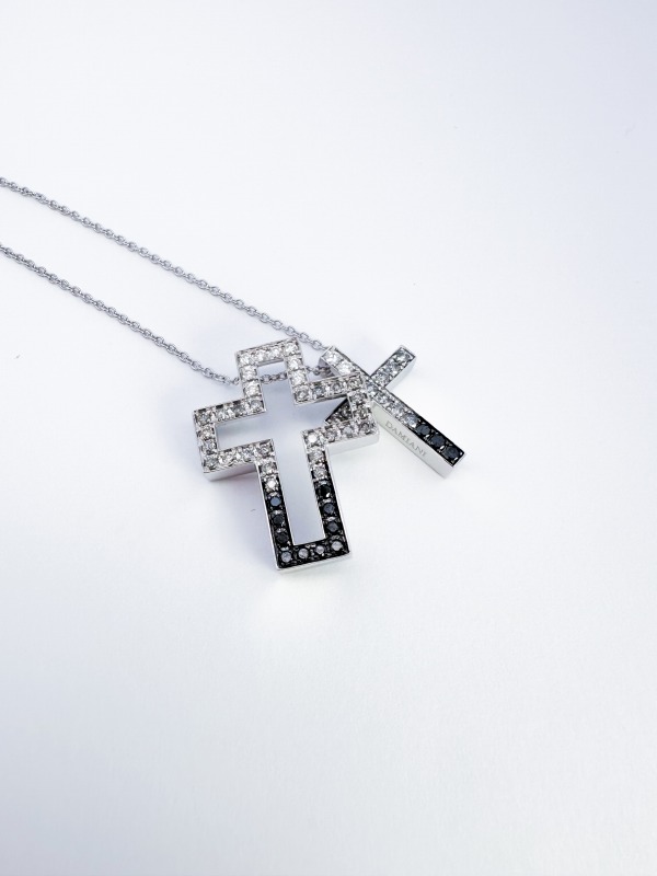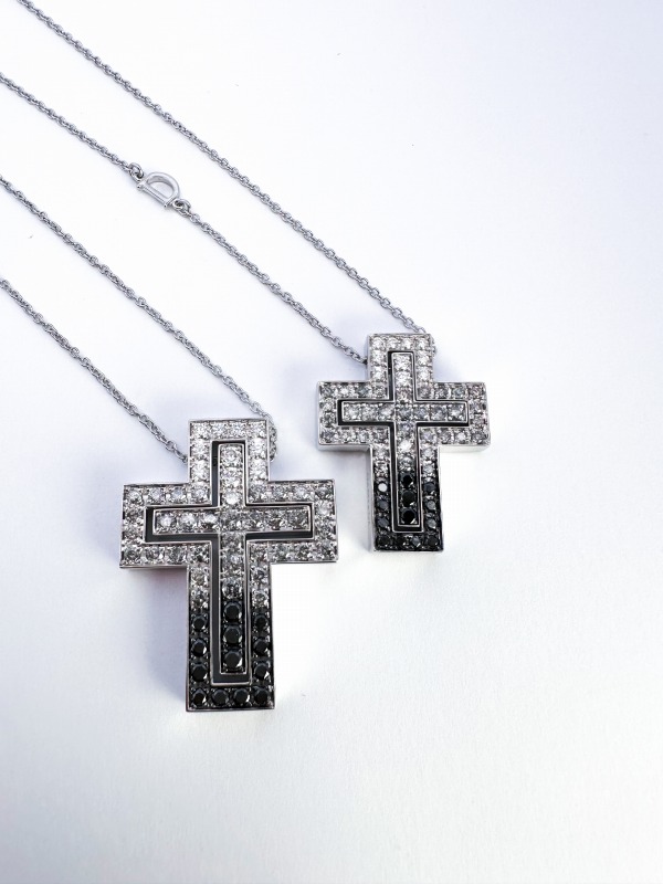 〈写真右〉品名:ベルエポック・ブラックシェード/クロスモチーフ:2.6cm × 2.0cm/品番:20102479/素材:ホワイトゴールド、ダイヤモンド /チェーン全長:約50cm/税込価格:963,600円〈写真左〉品名:ベルエポック・ブラックシェード/クロスモチーフ:3.3cm × 2.5cm/品番:20102480/素材:ホワイトゴールド、ダイヤモンド /チェーン全長:約50cm/税込価格:1,507,000円