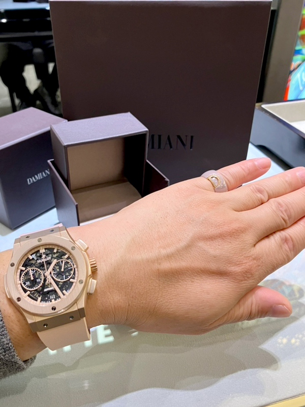 ダミアーニらしいグラマラスで情熱的な美学が凝縮されており、ウブロのピンクとはまた異なる、イタリア的な熱い色気を演出します。