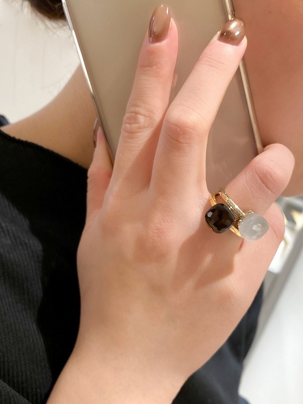 今回は、ポメラートのリングヌードから、スモーククォーツとミルキークォーツを組み合わせた、シックで優しい重ね着けスタイル。