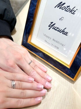 お選びいただいたのはゆるやかなカーブが優しい印象で、両サイドにひろがるメレダイヤモンドが華やかで上品な輝きを放つ美しいリング✨