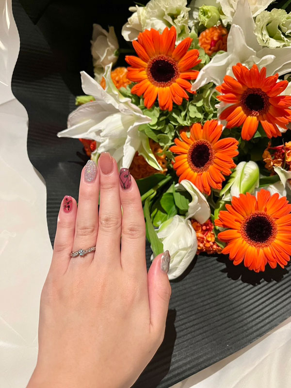 何回もお越しいただき、変わらないご意志でお選びいただいたこちらのデザイン、お相手様にとてもお似合いでございました🏵