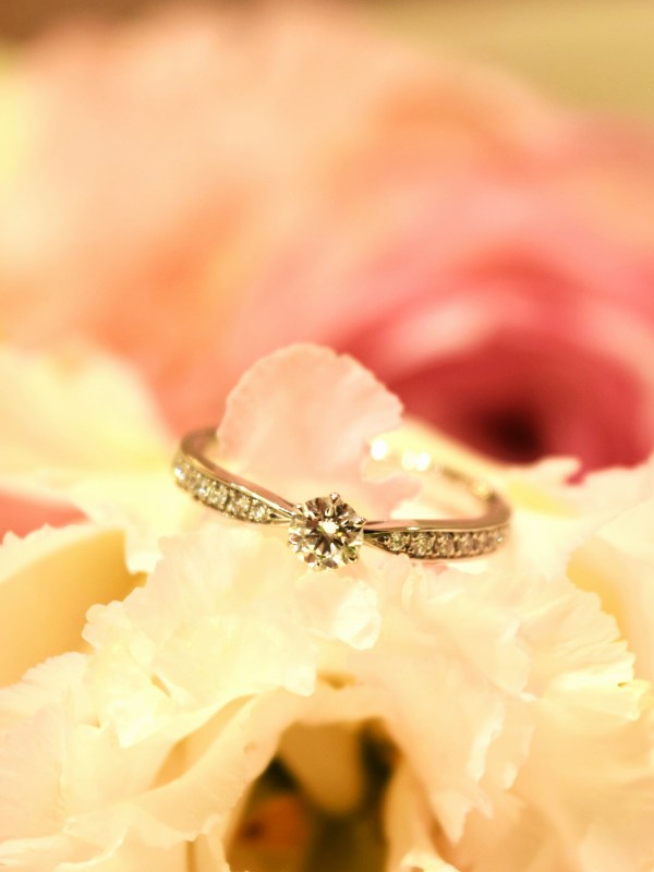 アームに彫り留めしたメレダイヤがセンターダイヤの輝きを一層引き立て、