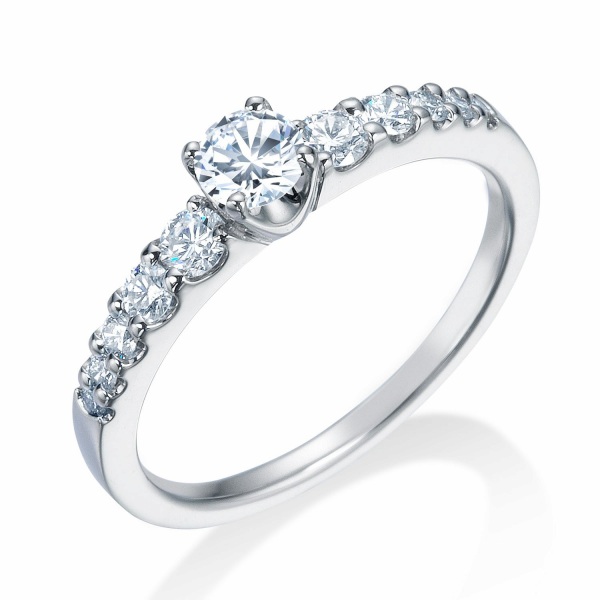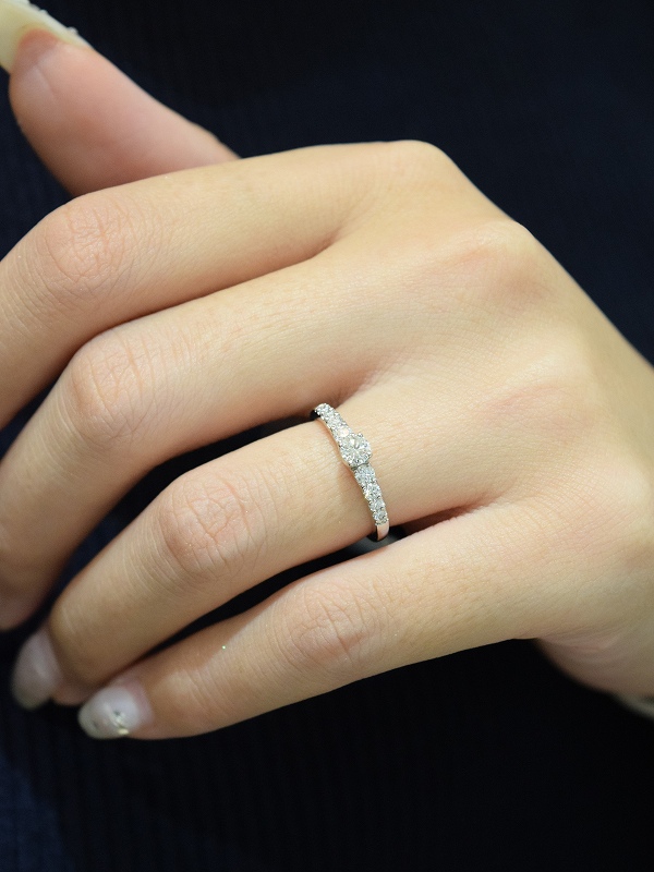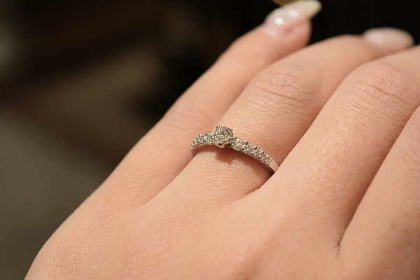 特徴は、センターダイヤモンドに向かってまるでグラデーションを描くようにメレーダイヤモンドの大きさに変化をつけ、ほどよいボリューム感を持たせている部分。