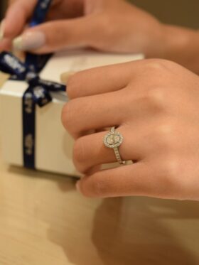 そしてアーム(指輪の腕部分)の細部まで贅沢に敷き詰められたダイヤモンドが