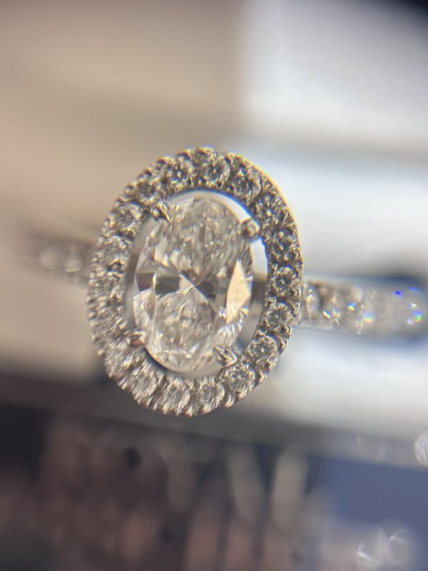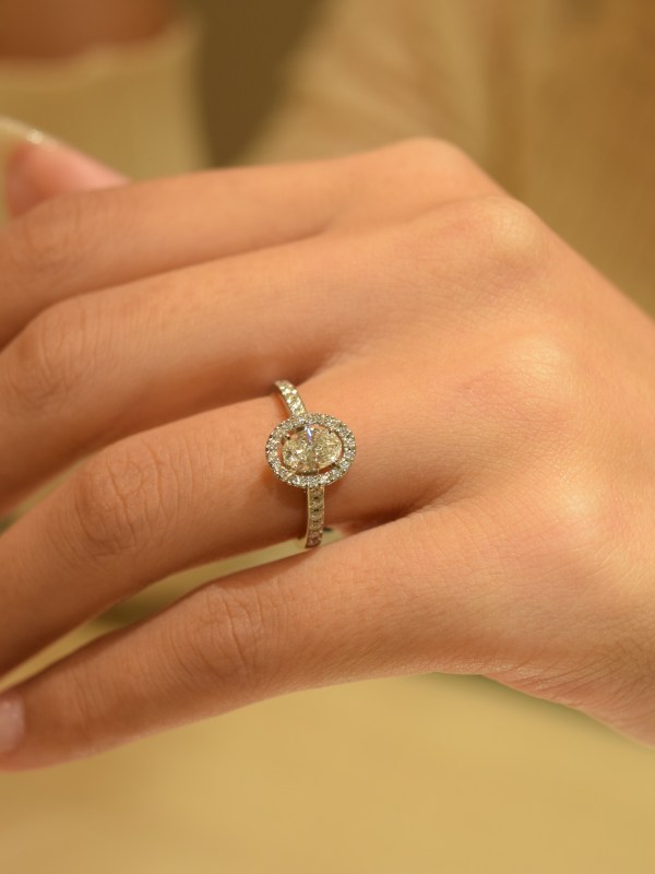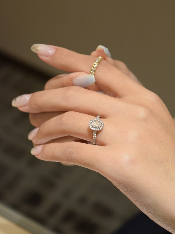 センターの大きなオーバルカットを囲むように配置されたメレダイヤモンド。