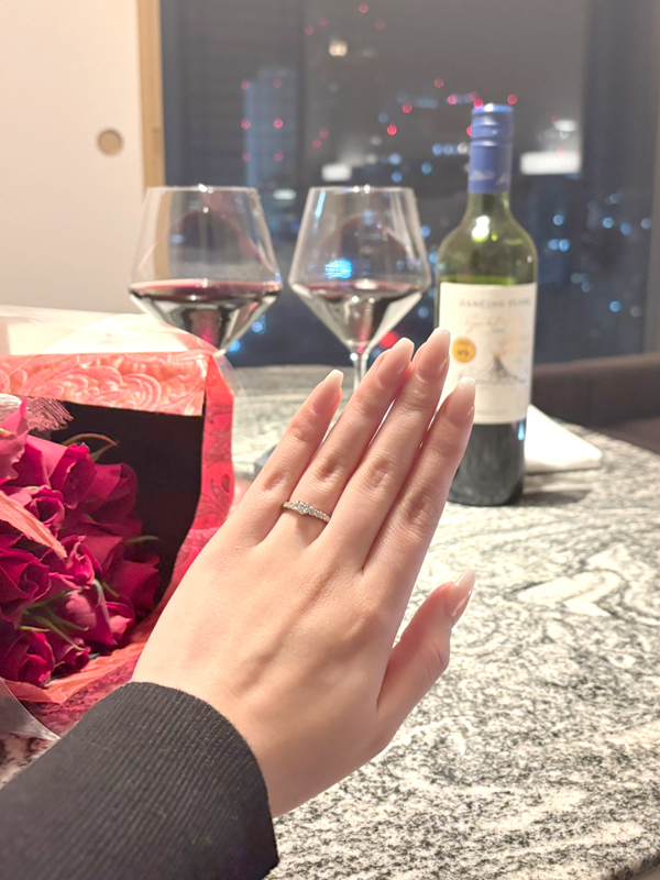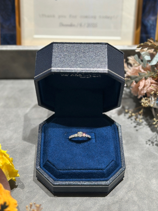 お選びいただいたのは、センターダイヤモンドに向かってグラデーションを描くようにメレーダイヤモンドの大きさに変化をつけ、ほどよいボリューム感を持たせたリング💎