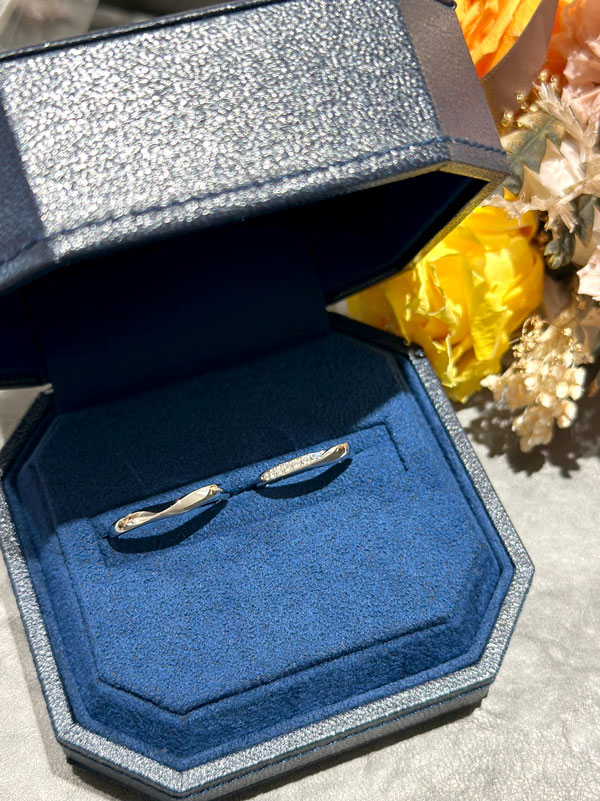 アシンメトリーで片側にダイヤモンドがセットされているV字デザインのご結婚指輪をお選びいただきました🕊