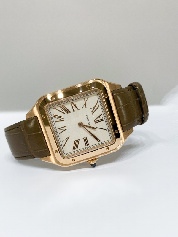 伝説的な飛行士のサインを刻印した、手巻きムーブメント搭載の「サントス デュモン」エクストラ ラージモデル。