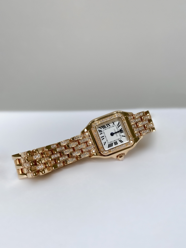 品名:パンテール ドゥ カルティエ ウォッチ/品番:CRWJPN0061/ケース素材:18Kピンクゴールド/仕様:ピンクゴールド製ケースにブリリアントカット ダイヤモンド36個(計0.25ct)シルバーダイアル、ブルースティール製剣型針。ピンクゴールド製ブレスレットにセミセットのブリリアントカット ダイヤモンド142個(計1.29cts)/サイズ:30.3mm x 22mm/ムーブメント:クォーツ/税込価格:7,458,000円(2025年12月)