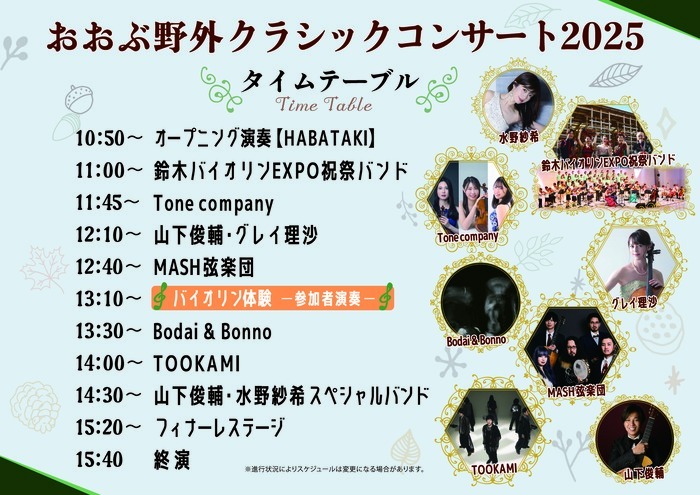 バイオリンの美しい音色と、緑のコントラストが目に鮮やかなこのコンサートで、心も体もリフレッシュできること間違いなしです!ぜひ、おおぶ野外クラシックコンサート2024に足をお運びください!!