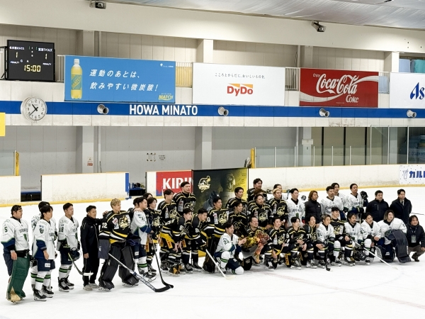 激闘の興奮が冷めやらぬアイスリンクでは退団セレモニーを終え、対戦相手であり最高のライバルとして全力を尽くした東京ワイルズの選手たちとお互いの健闘を称えた記念撮影が行われました。