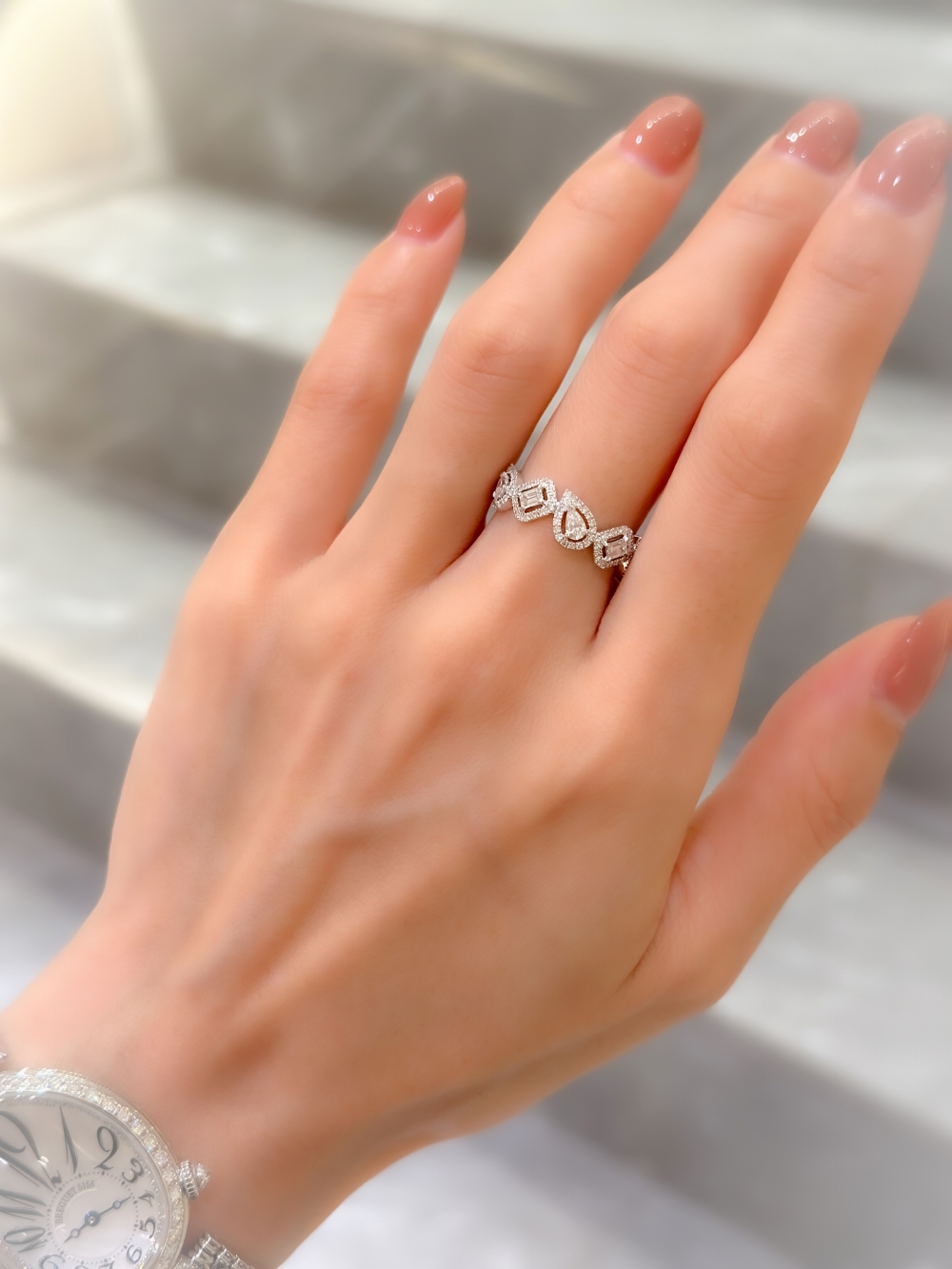 2種類のストーンが交互に向かい合うように配置されたリングは個性的なリングです。