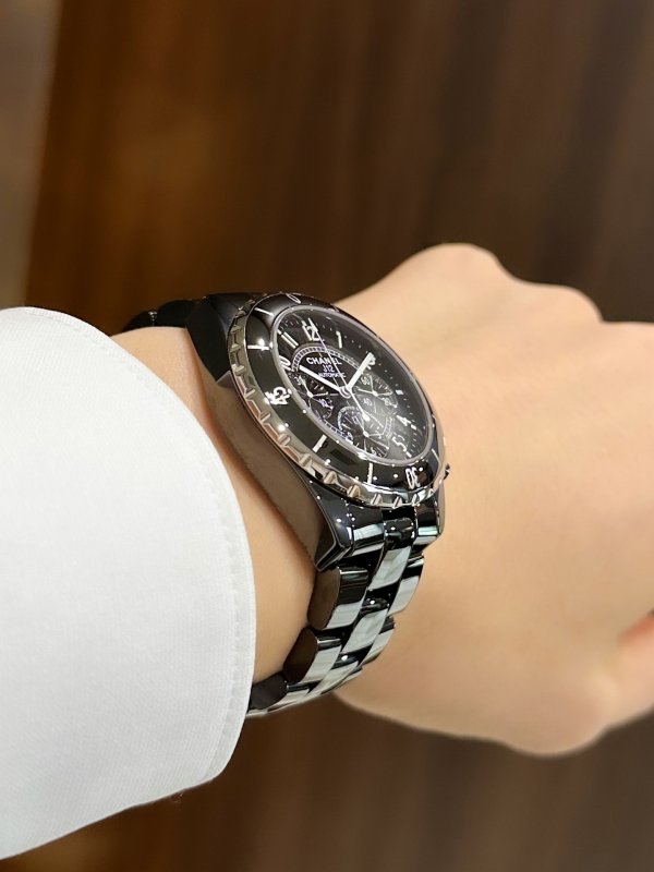 ユニセックスなイメージの強いJ12ですが、引き締まった印象のブラックだとマニッシュな仕上がりに。