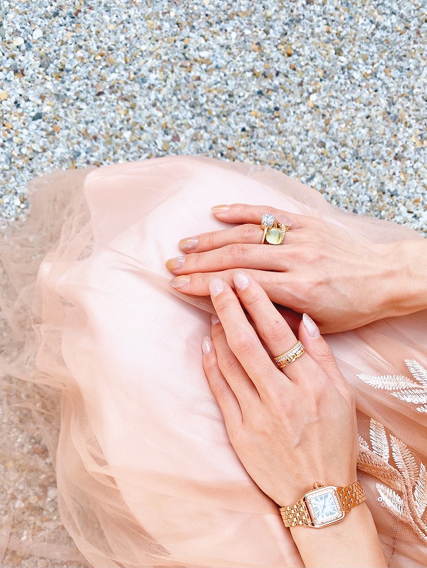 ピンクゴールドは淡い色のカラーストーンをプラスすることで表情がさらに優しくなりますので、おすすめのコーディネートでございます。
