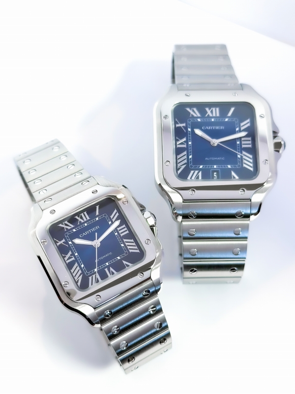 (写真右・MMサイズ)品名:サントスドゥカルティエ/品番:CRWSSA0063/ムーブメント:自動巻き/ケース:ステンレス/MMサイズ・ケース幅:35.1 mm、厚さ:8.83mm/防水:10気圧防水/税込価格:1,029,600円