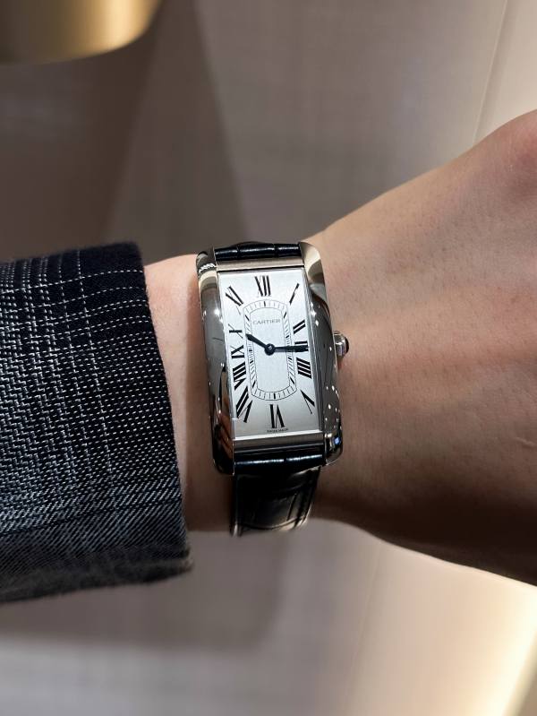 (下)品名:タンクアメリカン/品番:CRWSTA0082/ムーブメント:高効率クォーツ/ケース:ステンレス/ケースサイズ:SM(35.4mm × 19.4mm)/防水: 日常生活防水/税込価格:599,500円(2024年2月現在)