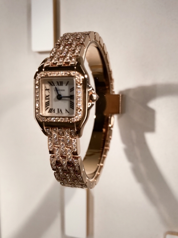 品名:パンテール ドゥ カルティエ セミパヴェ ミニ/品番:JPN0063/ケース:ピンクゴールド製ケースにブリリアントカットダイヤモンド32個(計0.15ct)/サイズ:25×20mm/厚さ:6mm/リューズ:ピンクゴールド製八角形リューズにブリリアントカットダイヤモンド1個(計0.02 ct)/ダイアル:シルバー仕上げダイヤル/針:ブルーステール製剣型針/ブレスレット:ピンクゴールド製セミパヴェブレスレットにブリリアントカット ダイヤモンド142個(計0.90ct)/バックル:ピンクゴールド製フォールディングクラスプ/ガラス:サファイア/防水: 日常生活防水(3気圧)/ムーブメント:クォーツ /税込予価:5,570,400円