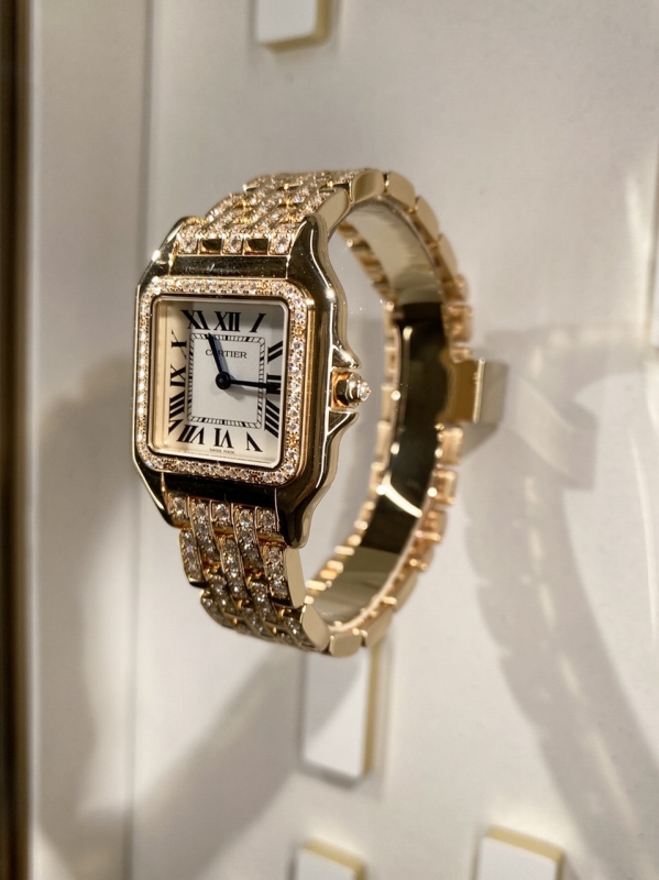 品名:パンテール ドゥ カルティエ セミパヴェ MM/品番:JPN0060/ケース:イエローゴールド製ケースにブリリアントカットダイヤモンド44個(計0.29 ct)/サイズ:36.5×26.7mm/厚さ:6.8mm/リューズ:イエローゴールド製八角形リューズにブリリアントカットダイヤモンド1個(計0.29 ct)/ダイアル:シルバー仕上げダイヤル/針:ブルーステール製剣型針/ブレスレット:イエローゴールド製セミパヴェブレスレットにブリリアントカット ダイヤモンド142個(計3.18ct)/バックル:ピンクゴールド製フォールディングクラスプ/ガラス:サファイア/防水: 日常生活防水(3気圧)/ムーブメント:高効率クォーツムーブメント /税込予価:8,580,000円