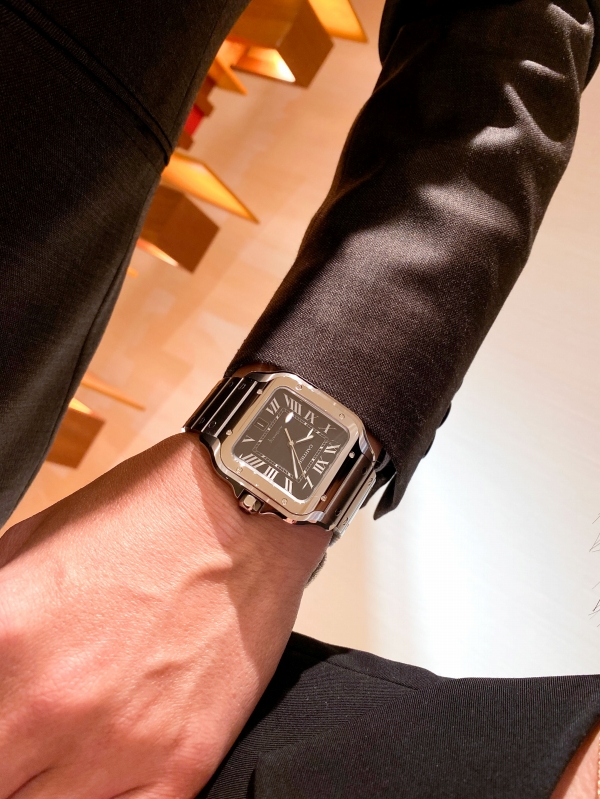品名:Santos de Cartier watch/品番:WSSA0096/ムーブメント:キャリバー 1847 MC 自動巻きメカニカルムーブメント/ケース:スティール製ケース、七角形のリューズにファセットを施したシンセティックスピネル、ブラック ダイアル、蛍光仕上げブラックスティール製剣型針、サファイアクリスタル/ケース幅:39.8mm、厚さ:9.38mm/防水:10 気圧/ストラップ:スティール製ブレスレット/税込価格:1,372,800円(2025年11月現在)