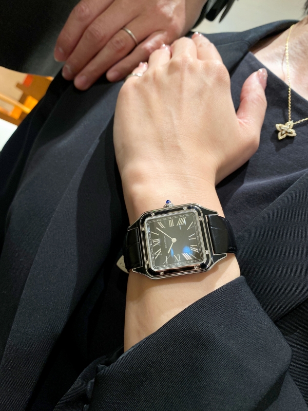 品名:Santos-Dumont watch/品番:WSSA0046/ムーブメント:キャリバー 430 MC 手巻きメカニカルムーブメント マニュファクチュール/ケース:スティール製ケースにブラックラッカー、パール状の飾り付きスティール製リューズにブルー シンセティック スピネルのカボション、装飾付きブラック スクエア ダイアルにトランスルーセントラッカー、ローマ数字、スティール製剣型針、サファイアクリスタル。ケースバックにアルベルト・サントス=デュモンが手書きしたサインのエングレービング/ケース幅:43.5mm x 31.4mm、厚さ:7.3mm/防水:日常生活防水/ストラップ:ブラックアリゲーター/税込価格:1,293,600円(2025年11月現在)