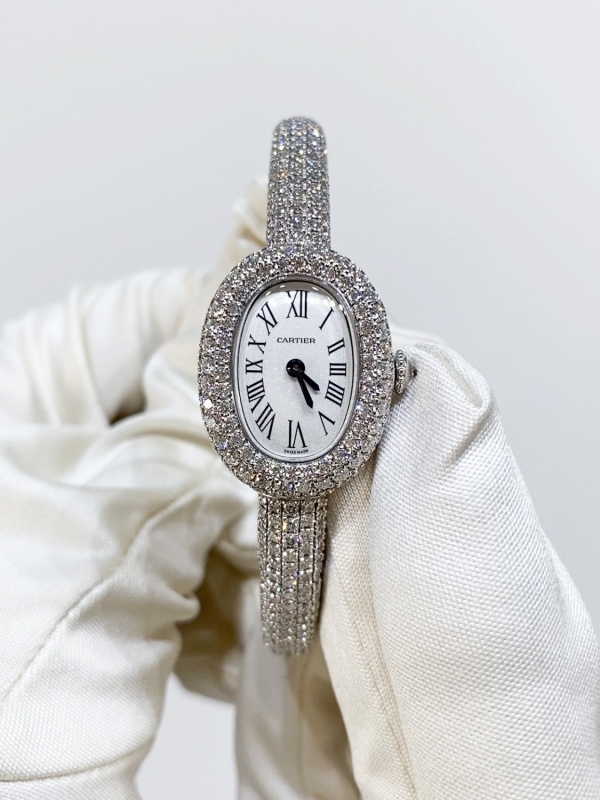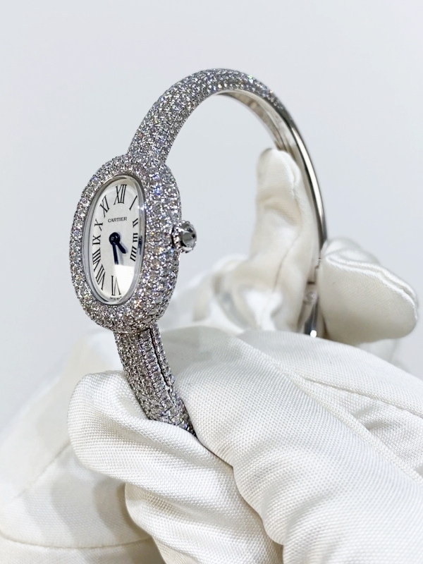 品名:ベニュワール ドゥ カルティエ ウォッチ ミニモデル/品番:HPI01607/特徴:ロジウム加工ホワイトゴールド750/1000製ケース、リジッドブレスレット、パール状の飾り付きリューズにブリリアントカット ダイヤモンド552個(計5cts)/税込価格:9,636,000円(2026年1月)