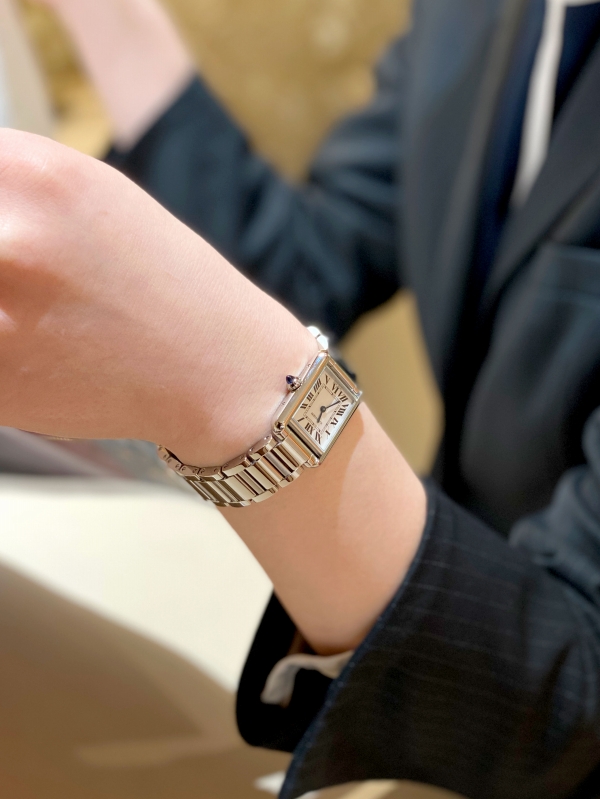 品名:タンク マスト ウォッチ、スモールモデル/品番:WSTA0107/ムーブメント:高効率クォーツムーブメント/ケース:ステンレススティール製ケース、パール状の飾り付きリューズにシンセティックスピネル カボション/ケース:サイズ:29.5mm x 22mm、厚さ:6.6mm/防水:日常生活防水/ストラップ:ステンレススティール/税込価格:605,000円 (2026年1月現在)