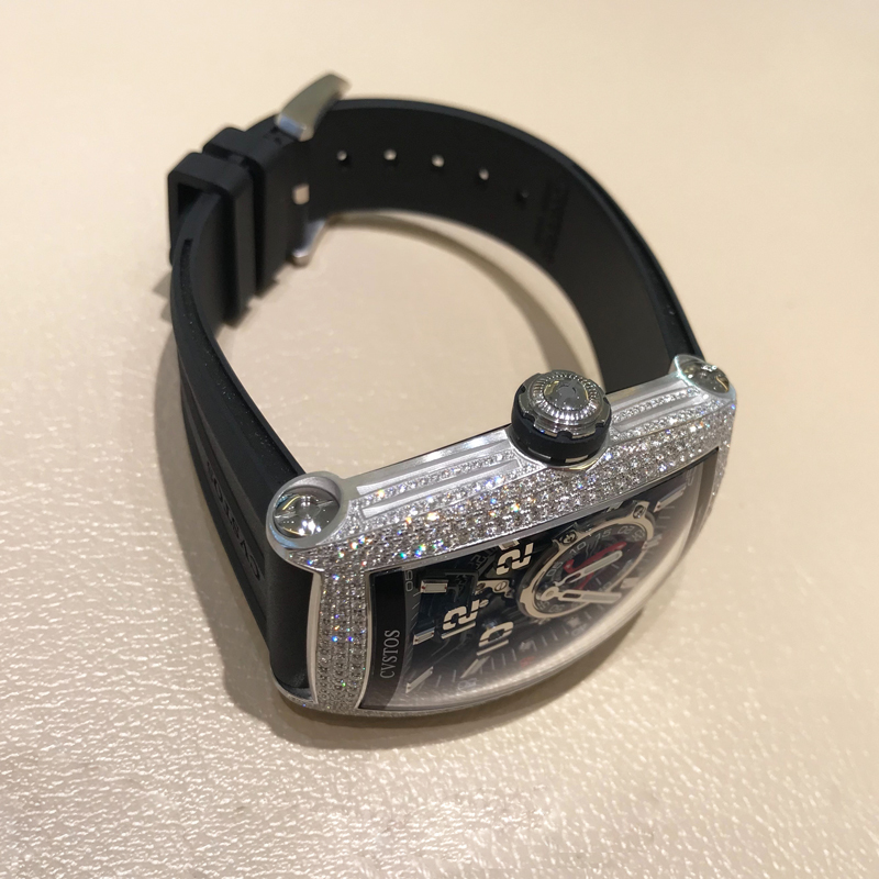 ケース全体に施されたダイヤモンドが華やかさ、高級さを演出。他のモデルにはない存在感を出しております。