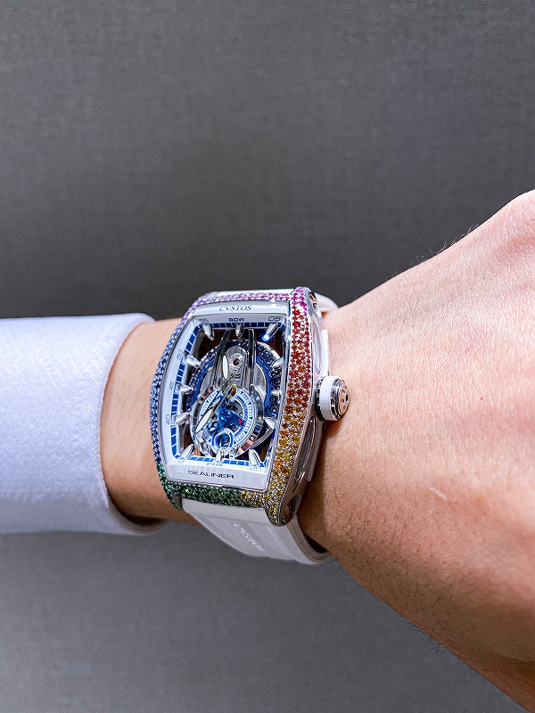 品名:クストス チャレンジシーライナー P-S レインボー/品番:CVT-SEA-PS-RB ST/ムーブメント:自動巻き/パワーリザーブ:42時間/防水:10気圧(100m)/ストラップ:ホワイトラバー/税込み価格:¥6,050,000