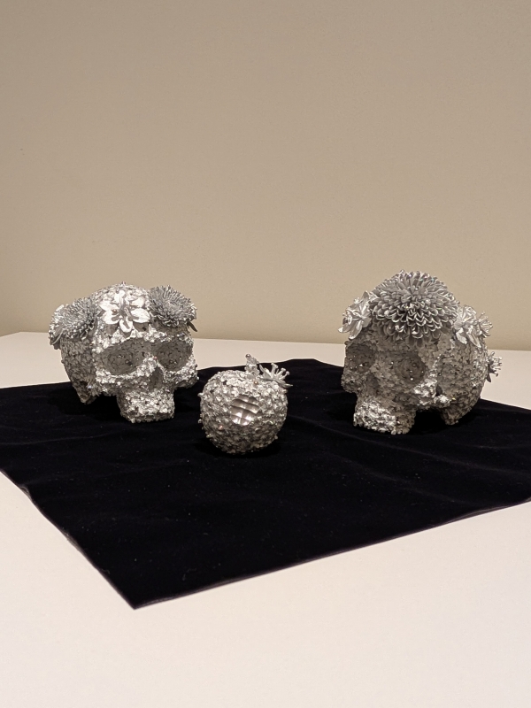 This work takes the motif of Adam and Eve from the Old Testament, depicting the skulls of a modern man and woman and the forbidden fruit they ate, all formed by the flowers of the Forget-Me-Not, which symbolizes “true love.”