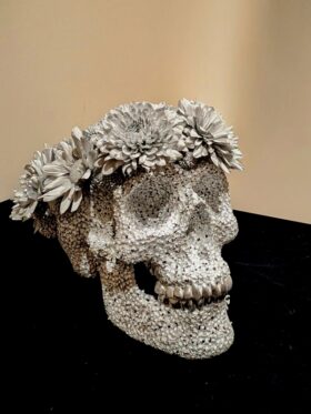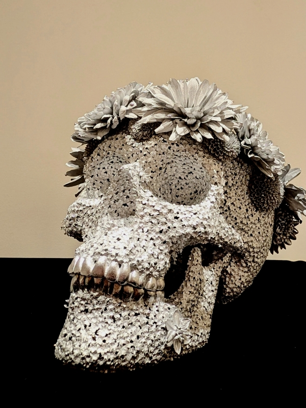 The motif of the skull is based on the theory that Neanderthals were the first to offer flowers to the dead.
