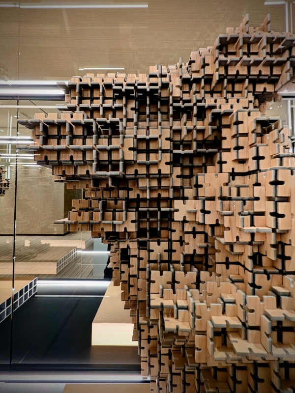 The material used is artificial imitation wood, crafted to emulate natural wood. This choice addresses the theme of the “tree”—a symbol of the Meiji Jingu Shrine’s forest, where the work was unveiled—while presenting a modern interpretation, distinct from traditional wood carving, achieved through digital technology.