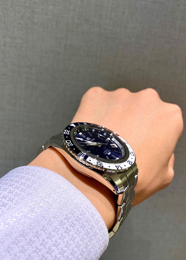 GSのブランドカラーのブルーが爽やかなエレガントスポーツモデルです。ロングセラーの人気スプリングドライブモデルSBGE201のデザインをベースにしています。