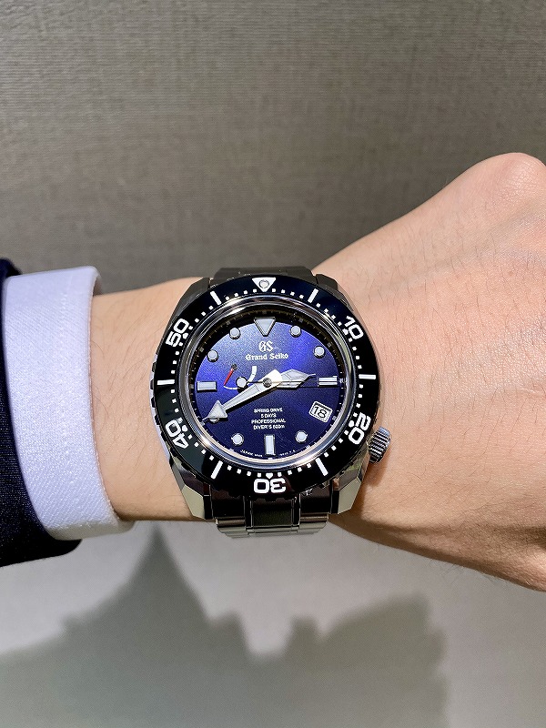 文字盤はグランドセイコーのイメージカラーでもあり、深海をイメージさせるディープなブルー。この時計の重厚感を際立たせています。