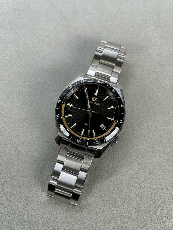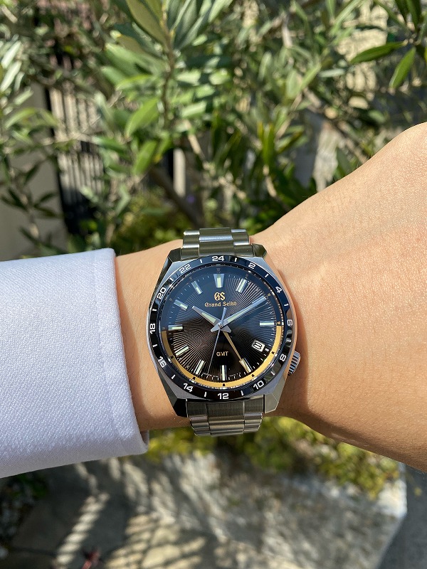 ゴールド色に輝くGSロゴ、ダイヤルリングとGMT針、そしてダイヤルの放射模様は、夜明けに輝く太陽の光をイメージしていて、グランドセイコーの新たな挑戦への強い意志を表現しています。