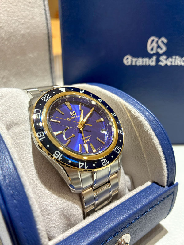 スプリングドライブGMTの卓越した精度に加え、ケースのゴールドブルーの組み合わせが非常に力強く、I様の腕元で強い存在感を放つことと存じます。