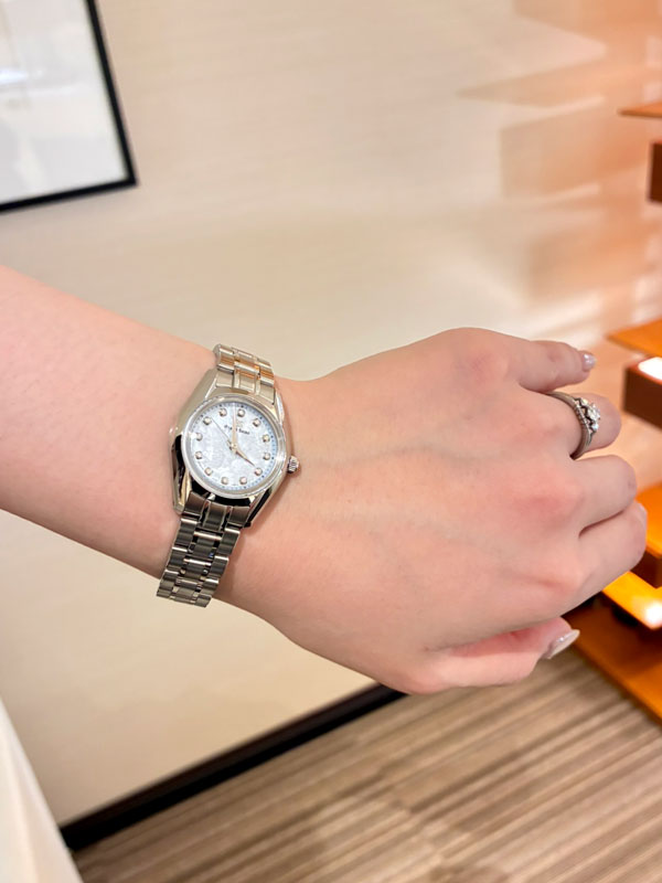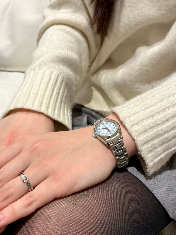 素敵な指輪の美しいダイヤモンドに寄り添うデザインが素敵なお時計です。