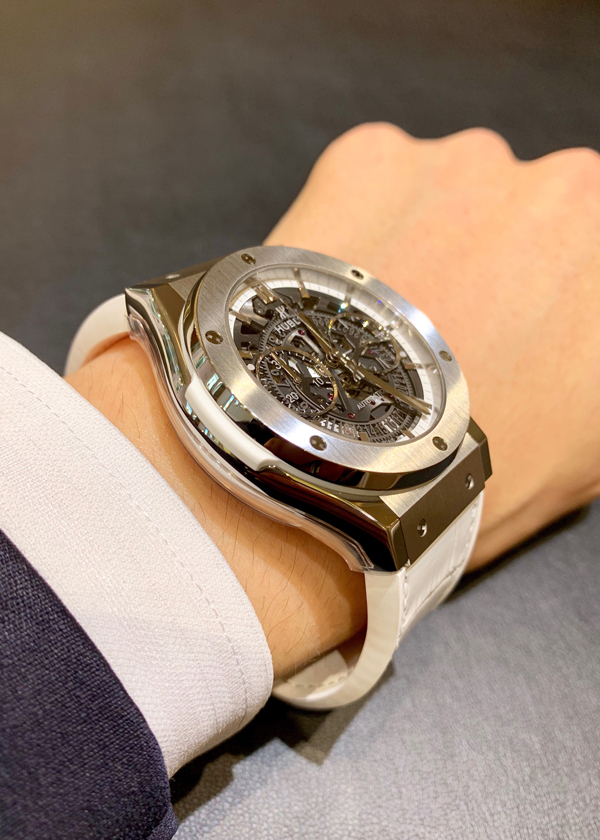 ウブロの中でも人気の高いモデルで、シンプルでエレガントなクラッシクフュージョンをベースにしつつ、両面スケルトンのサファイヤクリスタルガラスからムーブメントが見える迫力あるデザインが魅力的です。