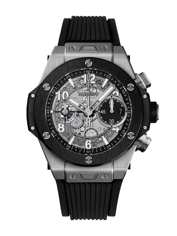品番:441.NM.1171.RX/ケース:チタニウム/ケースサイズ:44 mm/ムーブメント:HUB1280 自動巻きクロノグラフ(自社開発・製造“UNICO”)ムーブメント/パワーリザーブ:約72時間/防水:10気圧(100m)/ストラップ:ブラックラバーストラップ/価格: 3,003,000円税込(2024年8月現在)