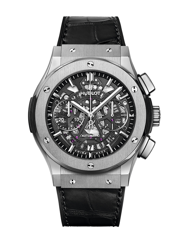 チタニウムケースにブラックアリゲーター×ブラックのラバーストラップがモダンな魅力をグッと引き立てる『アエロ・フュージョン クロノグラフ チタニウム』。
