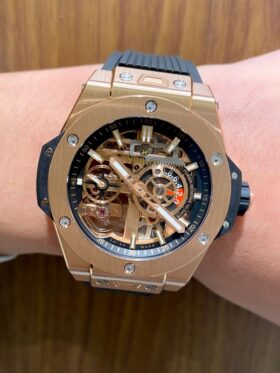 品名:メカ-10 キングゴールド/品番:444.OX.1180.RX/ムーブメント:マニュファクチュール手巻き HUB1205/パワーリザーブ 10日間/ケース:サテン&ポリッシュ仕上げの18Kキングゴールド/ケースサイズ:42mm/防水:10気圧/ストラップ:ブラックストラクチャードラバー(ライン入り)ストラップ/税込価格:5,863,000円(2025年12月現在)