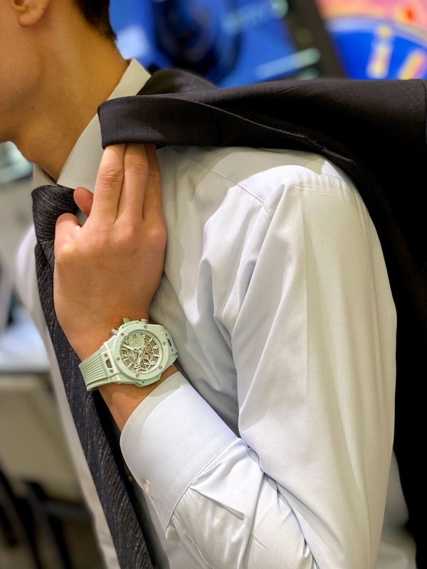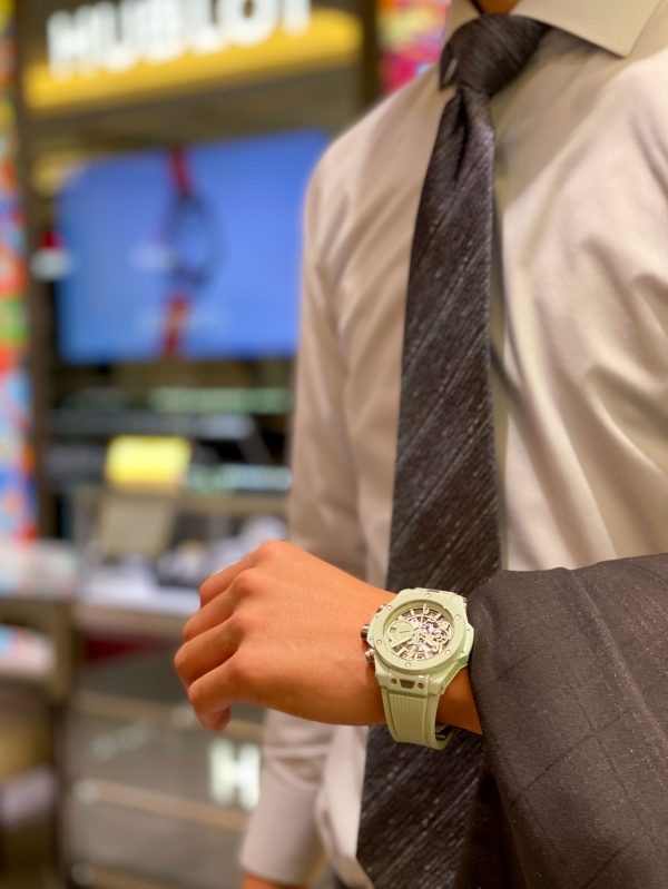 男性着用/品名:BIG BANG UNICO GREEN CERAMIC/品番:441.GS.5221.RX/ケースサイズ:42 mm/ムーブメント:自動巻きクロノグラフ/パワーリザーブ:72日間/ケース:ポリッシュ仕上げのミントグリーン/防水:10気圧/ストラップ:ミントグリーンのライン入りラバーストラップ/税込価格:3,311,000円(2025年12月現在)