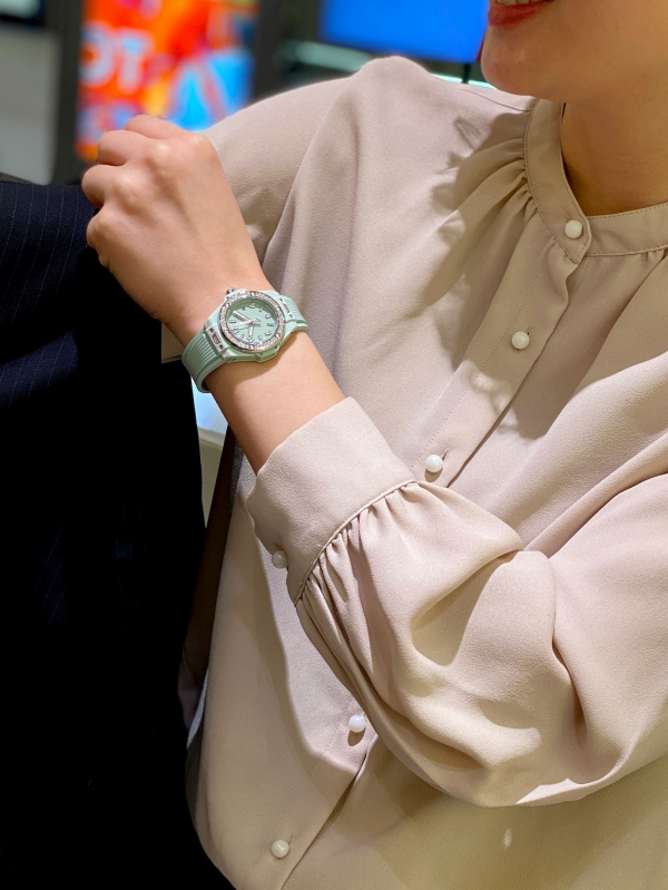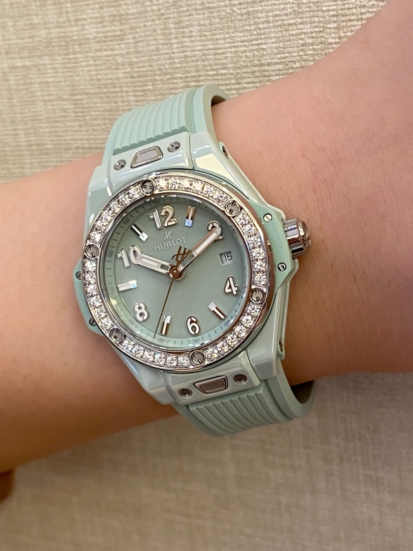 女性着用/品名:BIG BANG ONE CLICK MINT GREEN CERAMIC DIAMONDS/品番:485.GS.5271.RX.1204/ケースサイズ:33 mm/ムーブメント:自動巻き/パワーリザーブ:40日間/ケース:ポリッシュ仕上げのミントグリーンセラミック/防水:10気圧/ストラップ:ミントグリーンのライン入りラバーストラップ/税込価格:2,398,000円(2025年12月現在)