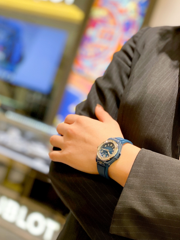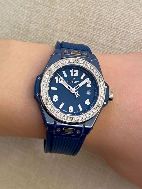 女性着用/品名:BIG BANG ONE CLICK PETROL BLUE CERAMIC DIAMONDS/品番:485.ES.5171.RX.1204/ケースサイズ:33 mm/ムーブメント:自動巻き/パワーリザーブ:40日間/ケース:ペトロールブルーセラミック/防水:10気圧/ストラップ:ペトロールブルーのライン入りラバーストラップ/税込価格:2,398,000円(2025年12月現在)