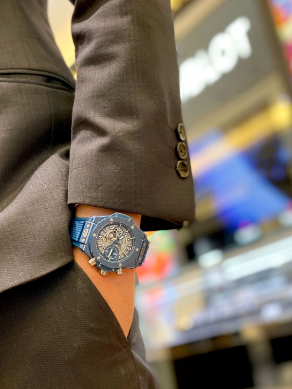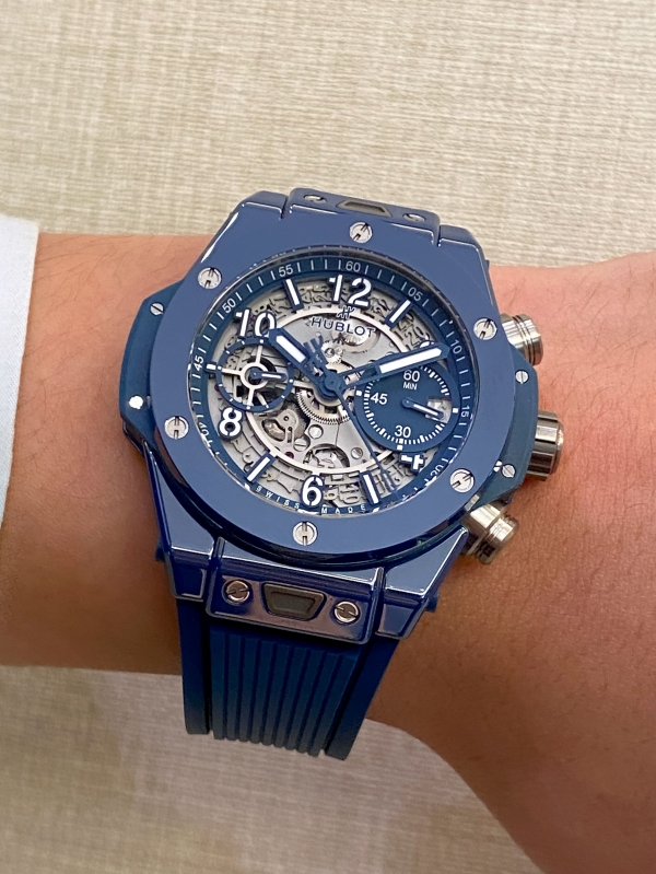 男性着用/品名:BIG BANG UNICO PETROL BLUE CERAMIC/品番:441.ES.5121.RX/ケースサイズ:42 mm/ムーブメント:自動巻きクロノグラフ/パワーリザーブ:72日間/ケース:ペトロールブルーセラミック/防水:10気圧/ストラップ:ペトロールブルーのライン入りラバーストラップ/税込価格:3,311,000円(2025年12月現在)
