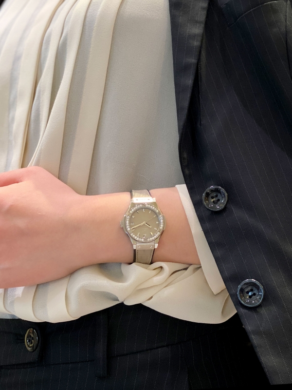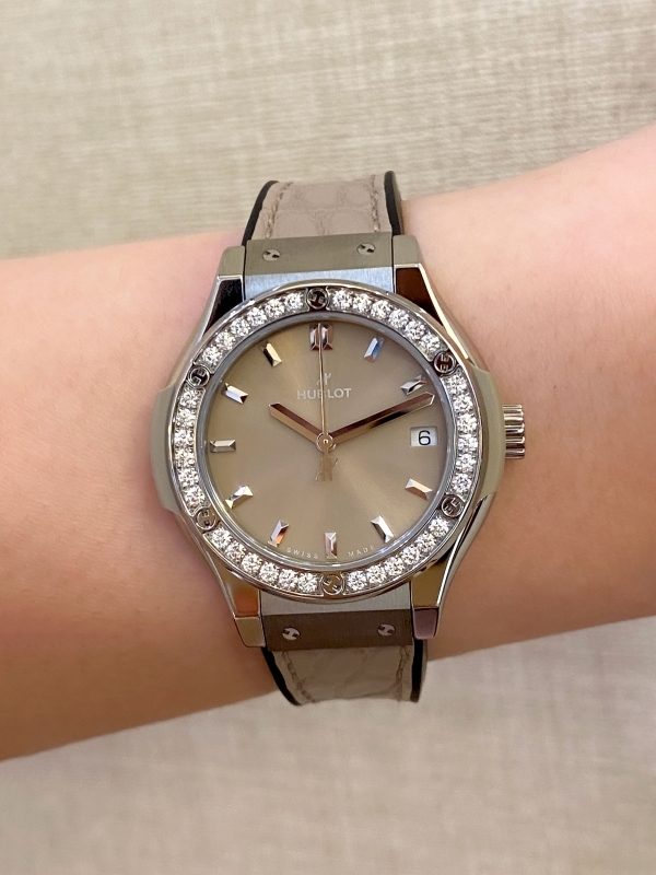 品名:ウブロクラシック・フュージョン チタニウムトープ ダイヤモンド/品番:581.NX.4670.LR.1104.JPN/ケースサイズ:33mm/ムーブメント:HUB2912 クォーツムーブメント/約2年間/ケース:サテン&ポリッシュ仕上げのチタニウム/ベゼル:ポリッシュ仕上げチタニウム 36個のダイヤモンド(0.8カラット)をセッティング/防水:5気圧/ストラップ:トープアリゲーター&ブラックラバーストラップ/税込価格:1,364,000円(2025年12月現在)