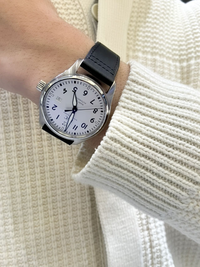 白文字盤と黒のストラップの組み合わせはスーツにも私服にも合わせやすいデザインです。