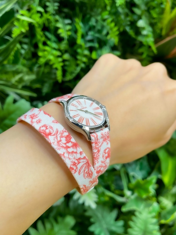 トワル・ドゥ・ジュイと言われるフランスの200年続く伝統的なデザインの生地を使用し、可愛さもあり気品さも漂うタイムピースへと見事昇華していますよね。